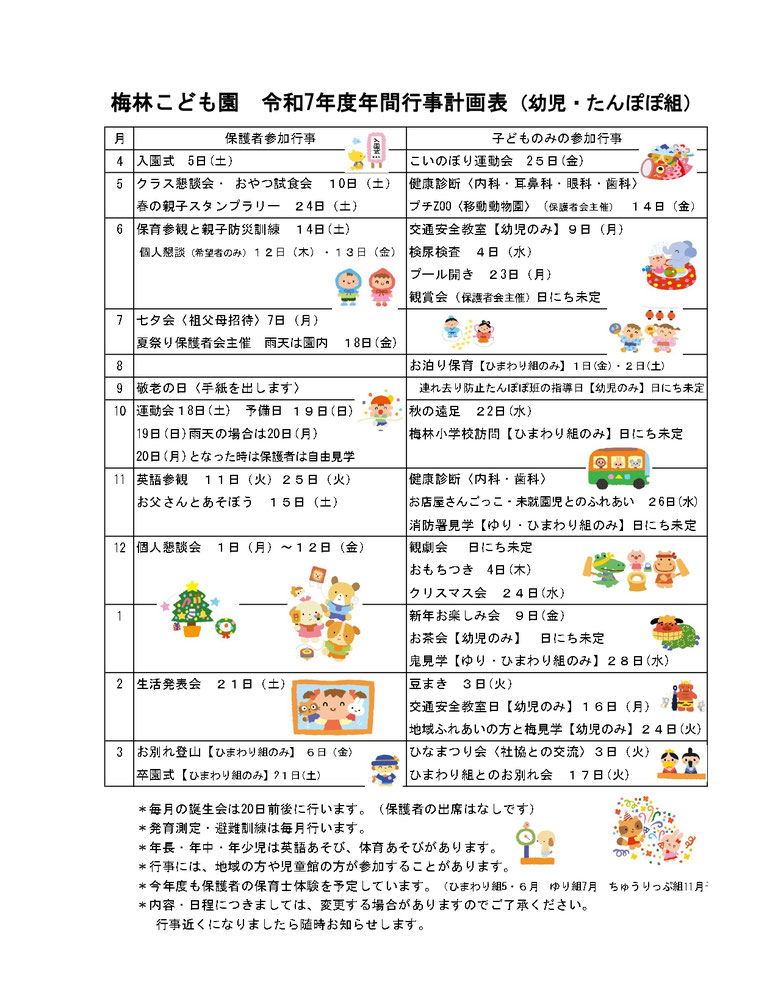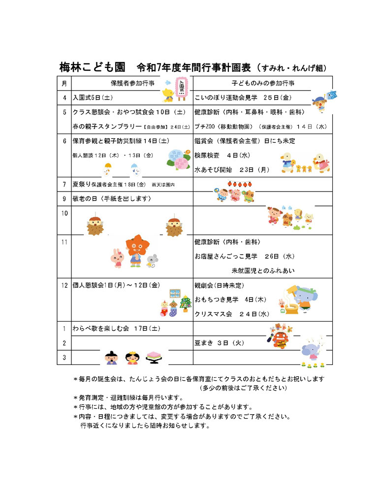 梅林こども園では、春秋の遠足、移動動物園、七夕、夏祭り、保育参観、プール開き、祖父母とのふれあい、運動会、親子スタンプラリー、