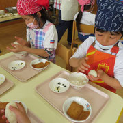 おやつのしらたまを自分たちで作りました。作り方の説明をじっと聞いておやつをつくりました