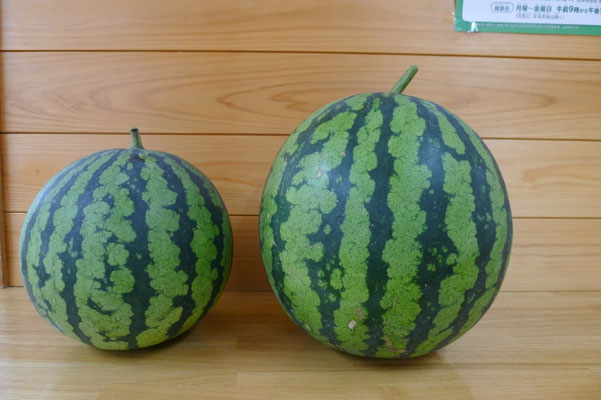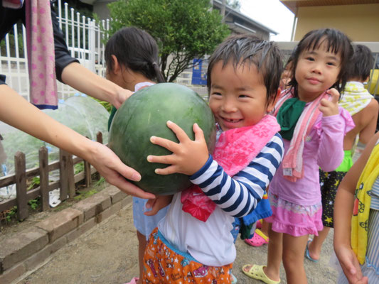 ゆり組さんが毎日水をかけて大切に育ててくれたスイカが取れました。大きくて丸いスイカ こどもたちも大喜びです。すいか割していただきました。