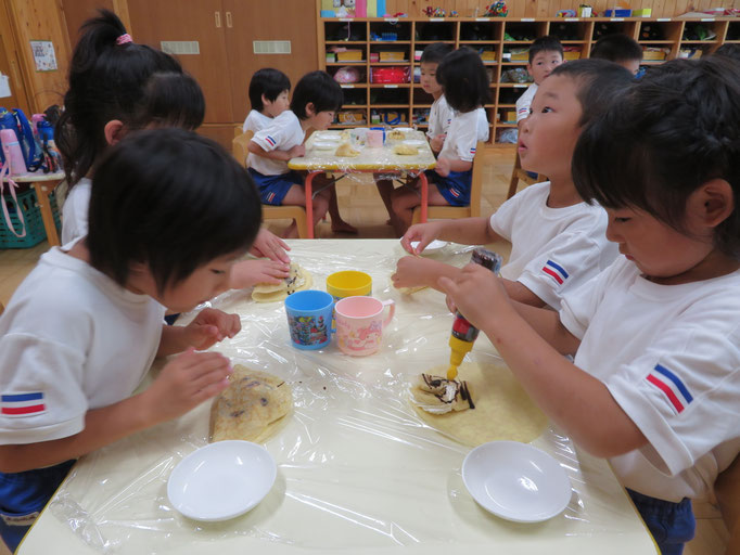 クレープを作りました。クリームを塗ってバナナをのせて、チョコソースもかけて、おいしくできたかな おうちでも聞いてあげてください